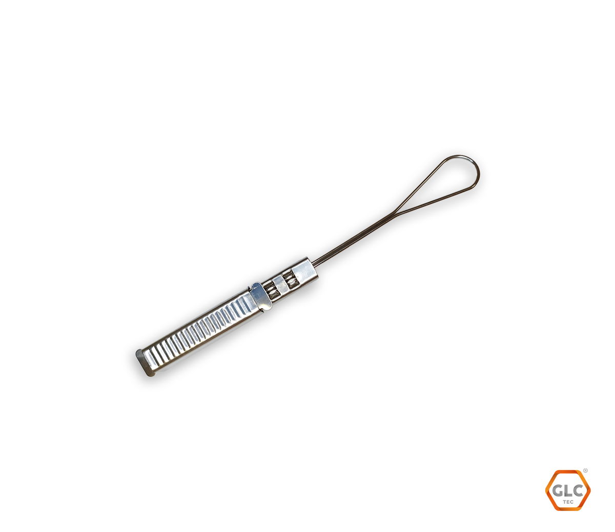 Mordaza de retención metálica tipo FISH CLAMP de la marca GLC, diseñada para la sujeción de cables de fibra óptica tipo OVAL y DROP en instalaciones aéreas.