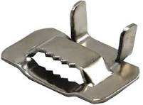 Hebilla de acero inoxidable: Es un clip o cierre metálico que se usa para sujetar firmemente un extremo de una cinta de acero. La hebilla tiene un diseño que permite que la cinta se doble y se tense para crear una abrazadera segura alrededor de un poste.