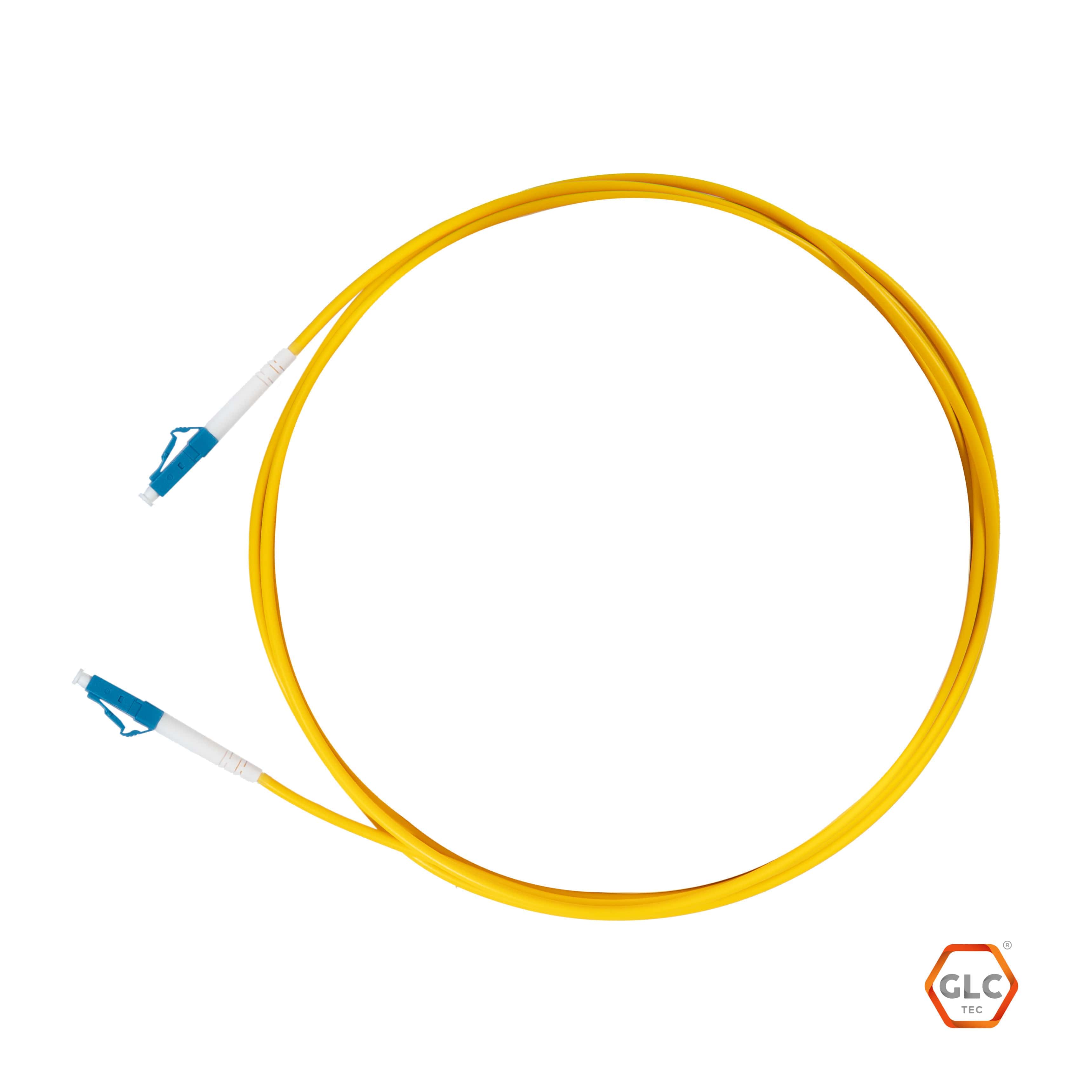 Cable de conexión de fibra óptica monomodo de 3 metros con conectores LC/PC en ambos extremos, para interconexiones en redes de transmisión de datos.