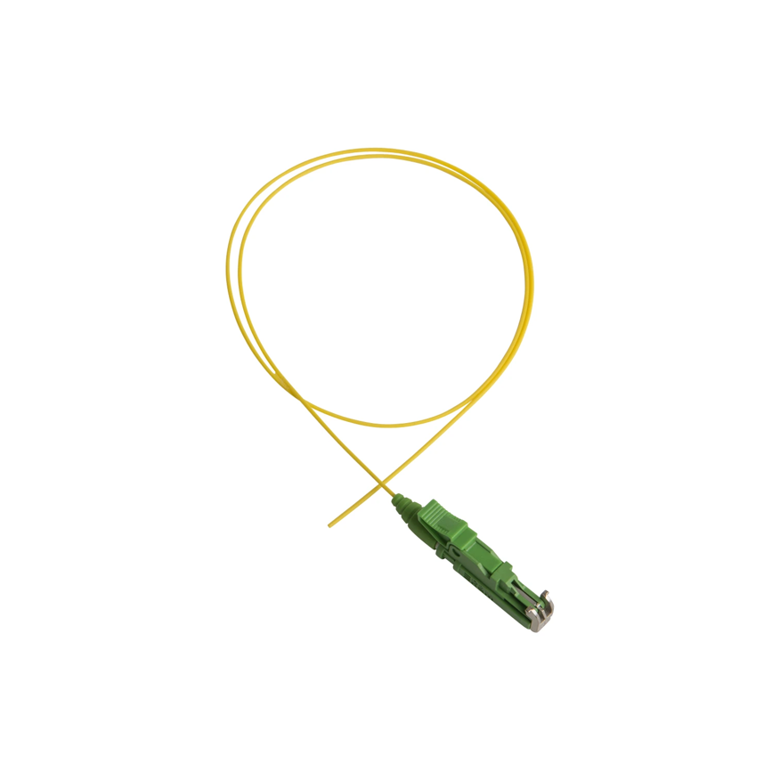 Pigtail de fibra óptica monomodo con conector E2000/APC de 3 metros, diseñado para empalmes en redes de alta densidad y seguridad.