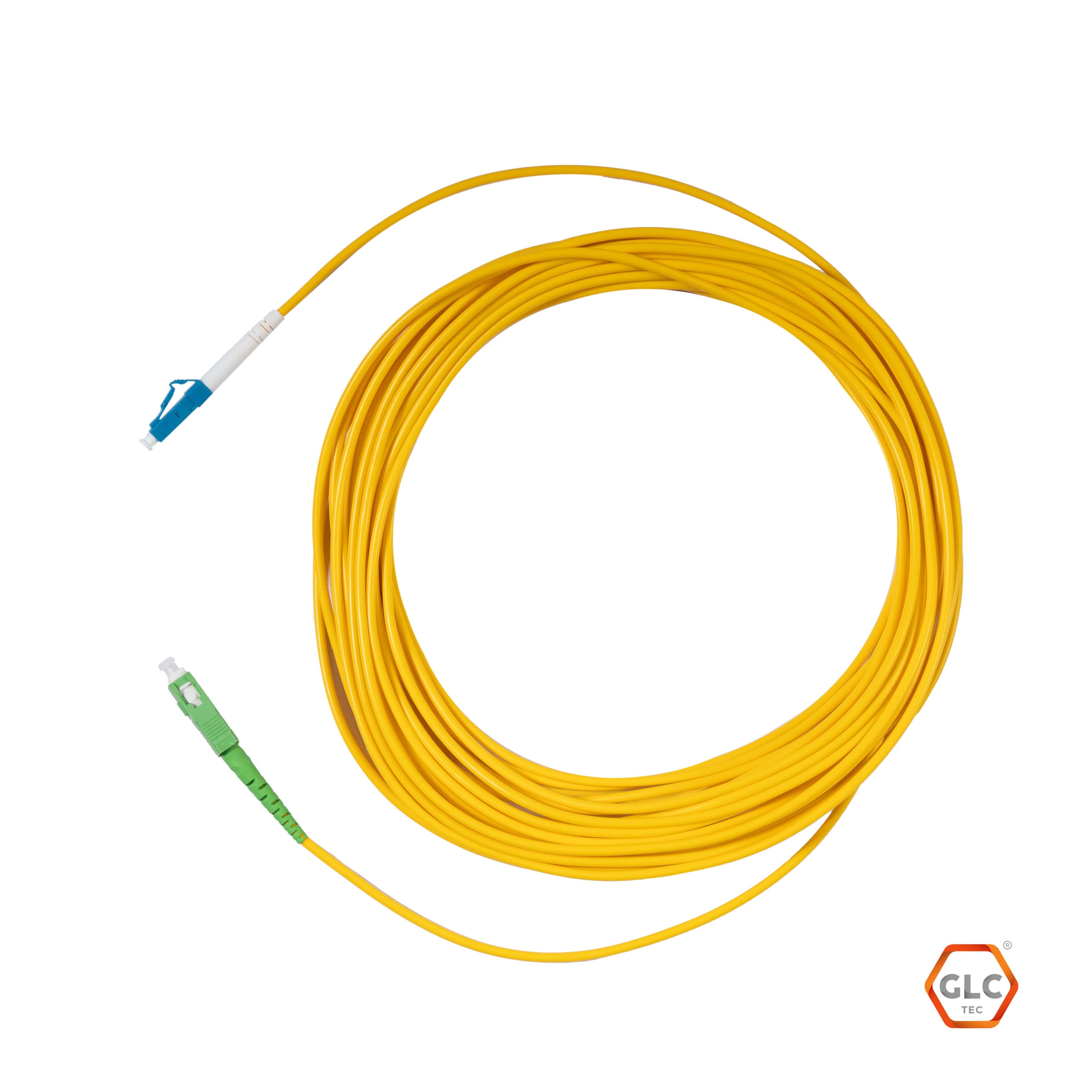 Cable de conexión de fibra óptica monomodo de 10 metros con conectores híbridos SC/APC y LC/PC, para interconexión entre equipos con diferentes interfaces.