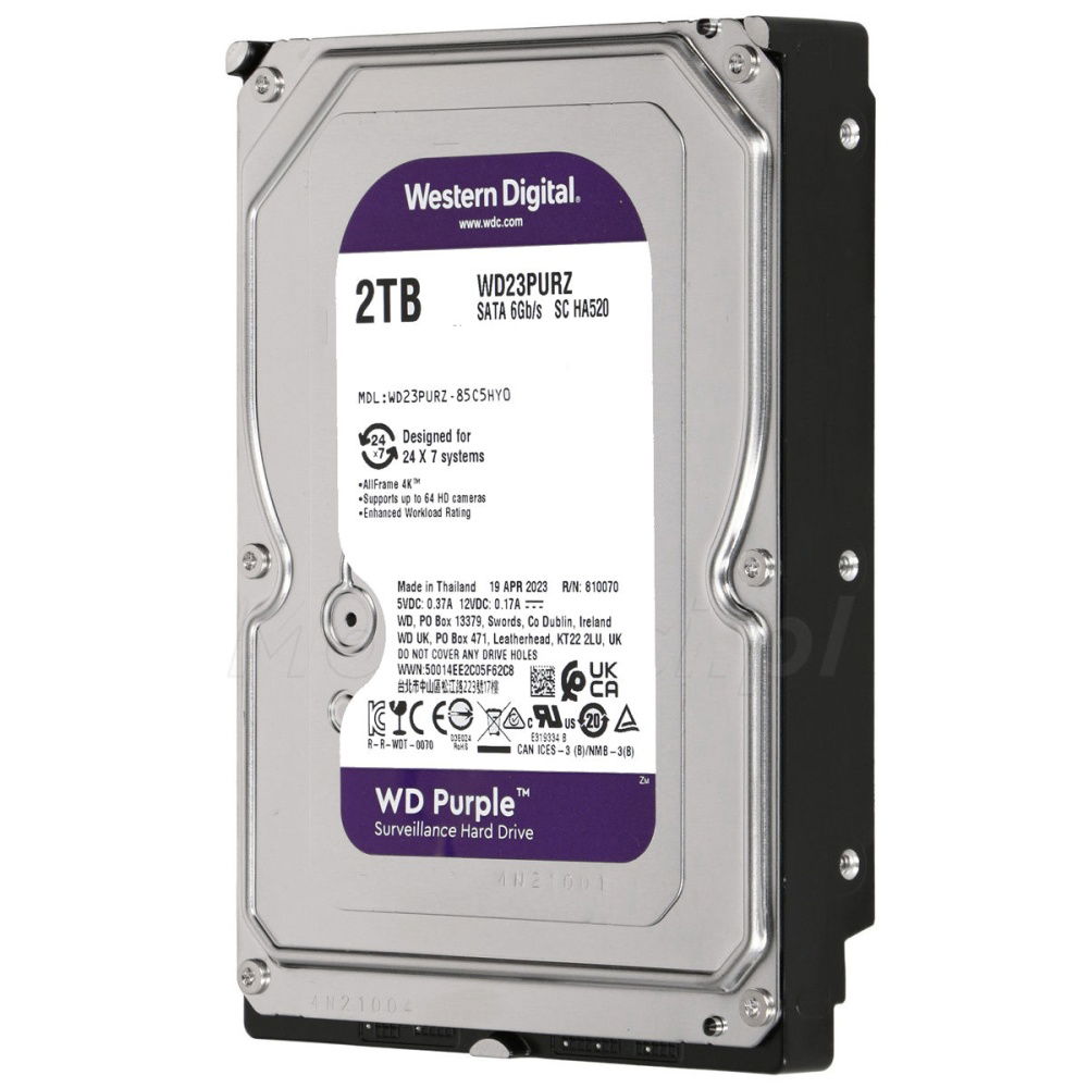 El Western Digital WD Purple de 2TB (WD23PURZ) está equipado con características fundamentales para un rendimiento sólido en videovigilancia. Ofrece una capacidad de 2000 GB (2TB), proporcionando un espacio adecuado para el almacenamiento de video de alta definición. Su interfaz Serial ATA garantiza una conexión estándar y una integración sencilla. Este disco opera a 5400 RPM, una velocidad optimizada para el flujo continuo de datos de video, y aunque la caché no se especifica explícitamente en el segmento de «Características» de la descripción, la información del SKU (WD23PURZ) y la serie Purple generalmente indican una caché de 64MB. Lo más importante es la tecnología exclusiva AllFrame™, que es clave para reducir la pérdida de fotogramas y mejorar tanto la grabación como la reproducción de video, asegurando que no te pierdas ningún detalle crucial.